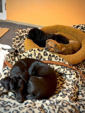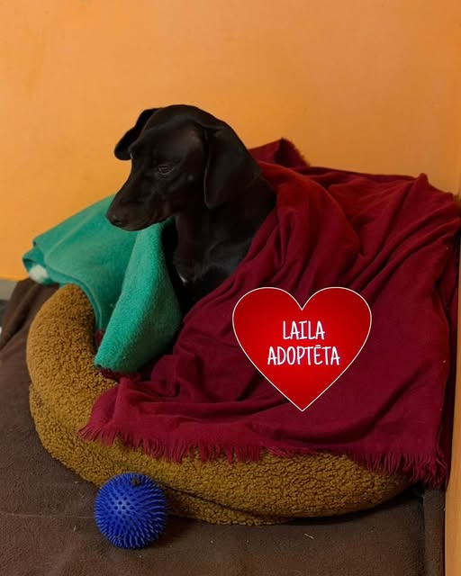 Tā es, mammīte Laila, ogļumelnā sunīte priekšplānā. Gultiņā tālāk mani brīnišķīgie bērniņi - Leona (mammas meitiņa) un Leons (tētuka dēliņš, lai kas ar viņš būtu, jo precinieku netrūka..). Mēs tikko izspriņģojušies, gardu ņammīti paēduši, ieritinājāmies uz diendusiņu. ❤️